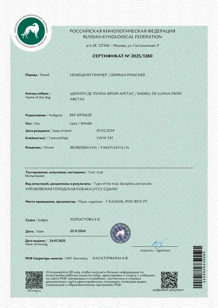 СЕРТИФИКАТ О СДАЧЕ ИСПЫТАНИЙ ПО КУРСУ "УПРАВЛЯЕМАЯ ГОРОДСКАЯ СОБАКА" (УГС)