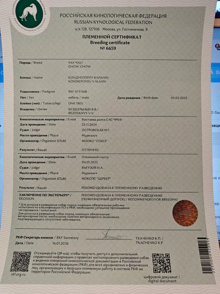 Рекомендован в разведение, пожизненный допуск к разведению